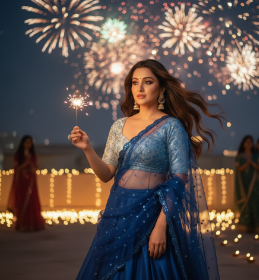 A stunning Indian woman celebrating Diwali in 4K HD, wearing a shimmering blue chiffon lehenga with a transparent blue dupatta that has a thin sequined border, draped in the front, slightly revealing a light blouse underneath. She is holding a single sparkler (phuljhari) in one hand. Her hair is silky, shiny, and dark brown, reaching down to her waist, gently blowing in the breeze with a soft lock touching her left cheek. She has minimal makeup with bold kajal and winged eyeliner, wearing large antique-style jhumka earrings. The background shows a Diwali celebration with people and bursting fireworks in the night sky, but softly blurred to keep the focus on her. Her face must be 100% exactly the same as in the uploaded reference image.