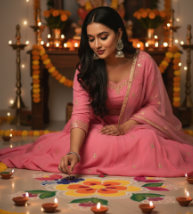 A beautiful Indian woman sitting on the floor making a rangoli during Diwali celebrations, captured in 4K HD. The festive atmosphere includes rows of lit diyas around her and garlands of flowers hanging in the background. She is looking down gracefully while creating the rangoli. Her hair is very long, open, with a soft lock touching her left cheek. She is wearing a pink Anarkali dress with a transparent dupatta. She has large antique-style jhumka earrings, and is sitting cross-legged in a way that one anklet (payal) is visible. Her face must be 100% exactly the same as in the uploaded reference image.
