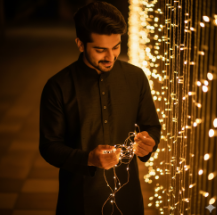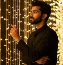 A young man dressed in an elegant black kurta, standing near glowing golden fairy lights that create a magical festive atmosphere. He is slightly leaning forward with one hand softly brushing against the lights while the other hand rests casually in front. His eyes are looking into the distance with a dreamy, hopeful expression. The camera is positioned at a lower angle, giving a tall and confident appearance, with shallow depth of field that makes the background fade into warm golden bokeh. His hairstyle is voluminous and perfectly styled, beard neatly groomed, face illuminated with a soft golden glow. Hyper-realistic, ultra-detailed 4K quality, cinematic portrait, professional lighting, festive mood, photorealistic DSLR shot.”