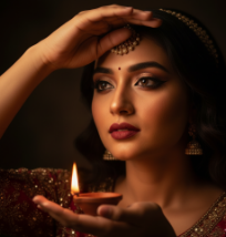 Indian female (use my precise face 100%) with the lit lamp of a diya in her palm with warm candlelight shining on her face in an unlit background. Her eyes are bold perfect eyebrows and is wearing a deep matte lipstick. The bindi, which is black in color, sits placed on her forehead. her hair is decorated with the traditional silver jhumka earrings. The other hand is elevated over her forehead and casts shadows that are subtle, and the flame is reflected softly into the eyes of her beautiful.