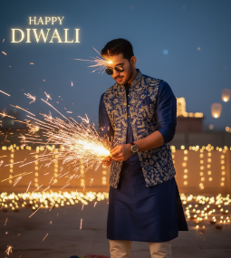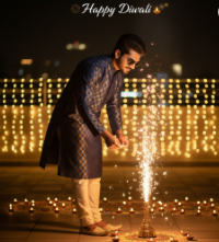 Full-body, super-realistic, 8K cinematic image of a charming young man (face perfect match to the reference photo uploaded) with sleek black sunglasses. He’s lighting bright Diwali celebration fireworks (patakhe) Sparks are flying quickly and in slow-motion and casting golden warm reflections upon his sunglasses and face. Dress code: Traditional Diwali festive attire, including exquisitely embellished kurtas, churidars or festive pants, as well as elegant accessories such as watches or bracelets.