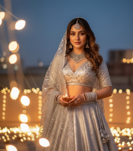 A H 24k image of a beautiful Indian woman standing in front of a shirt, sporting a lehenga shades of silver with a sleeveless the nack blouse, and silver lehenga with net duppata, an earring and matching bangle as well as mangtika. Soft and creamy bokeh effect created by light lamps and flare light is visible on the background. It is a different fashion. The diyas on the rooftop will be lit