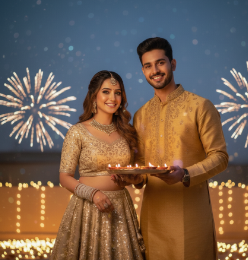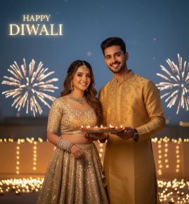 Extremely realistic 8K hyper-detailed vivid Diwali half-body portrait of a couple. Lovelyly decorated Indian terrace and fairy lights. Glowing diyas and a soft, DSLR-style blurred background and distant fireworks (cinematic Bokeh). The boy (20, South Asian, slim-fit) dressed in a royal golden embroidering shirt, holding a thaali decorated and glowing diyas. Face is like the image referenced and a warm, happy smile. The girl is wearing a golden lehenga featuring shimmering braids, an edgy hairstyle with traditional jewellery, light diya. The face is glowing with a graceful, happy smile. Gold glow emanating from diyas glittering highlights, romantic cinematic shades. Text overlay Happy Diwali “.