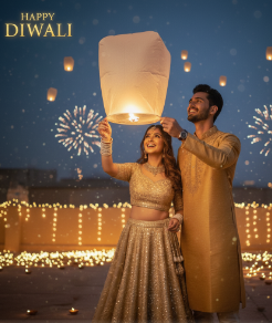 Super-realistic, 8K high-detailed and vivid Diwali couple portraits at a different perspective. Gorgeously decorated Indian terrace with sparkling diyas, fairy lights Soft blurred backgrounds in DSLR style featuring distant fireworks (cinematic Bokeh). Sky lanterns fluttering over the backdrop. Boy (20, South Asian, slim fit) in royal golden embroidered kurta. Face is similar to reference picture with a festive smile. Girl wearing golden lehenga adorned with sparkling embroideries, a festive haircut, traditional jewellery. They hold a sky lantern and looking upwards with smiles of joy. The golden glow of diyas glittering highlights, romantic cinematic tones. Text overlay:”66 Happy Diwali