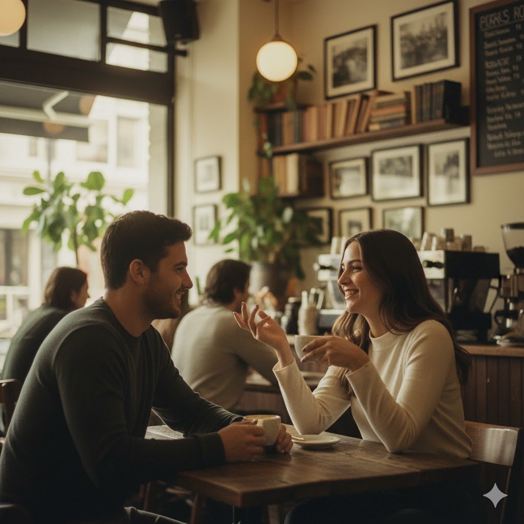 - “ Vintage Coffee Shop Background, Couple in Chatting Position with Soft Blur Effect and Lifestyle Photography Style.”